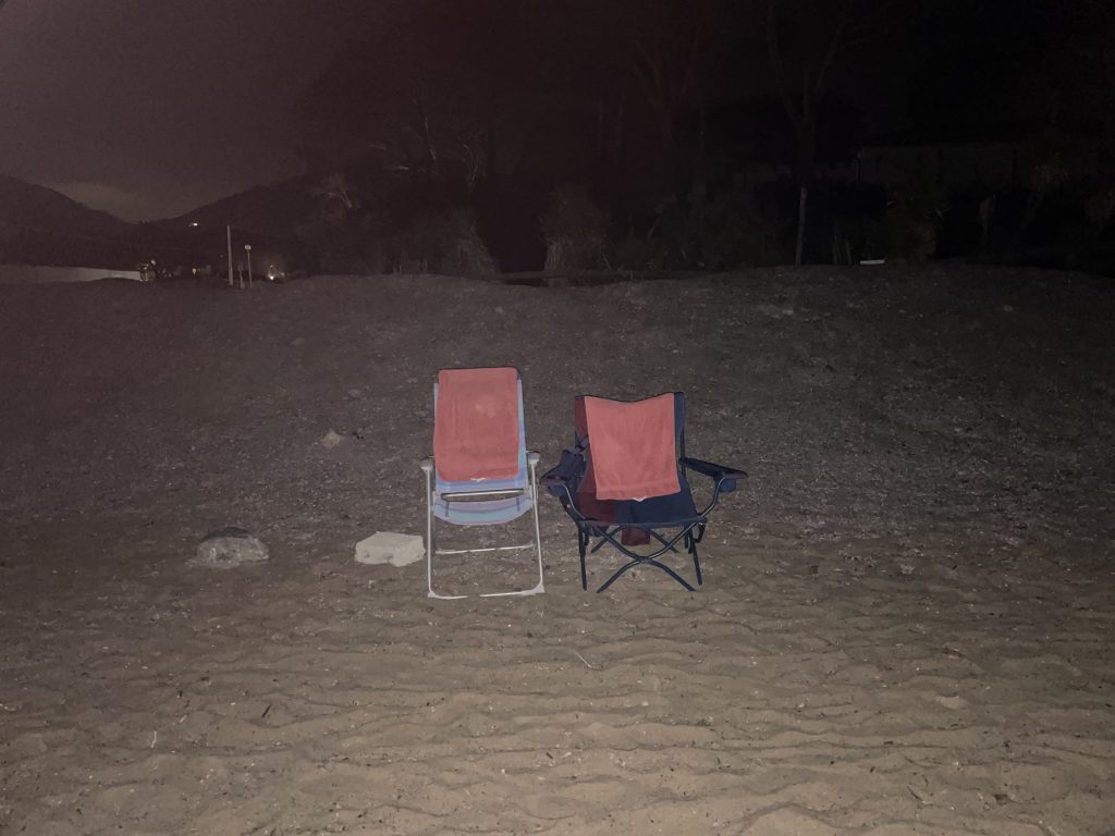 Zwei einsame Strandstühle. Auf dem Rückweg von Essen im „Il Pirata“