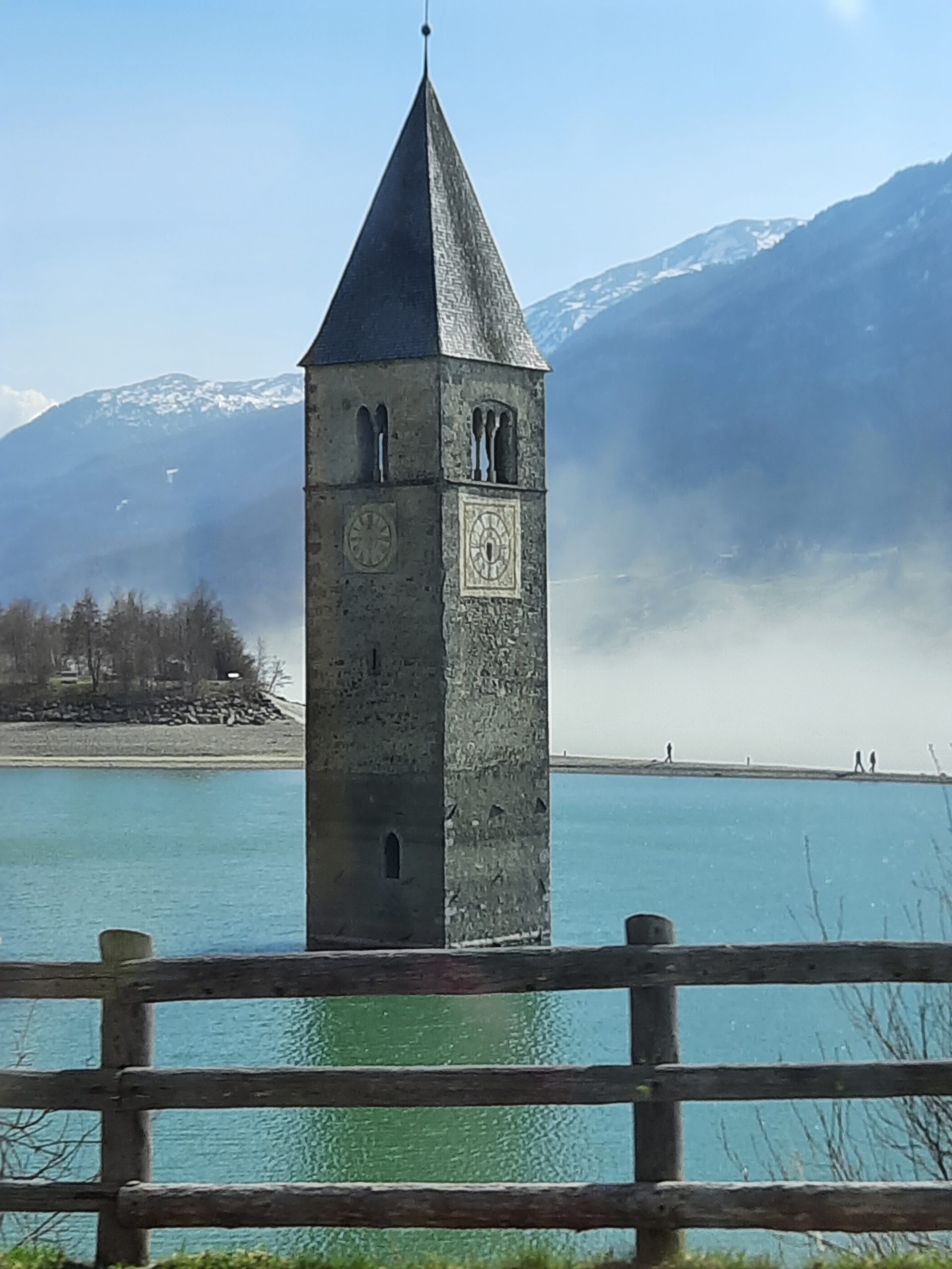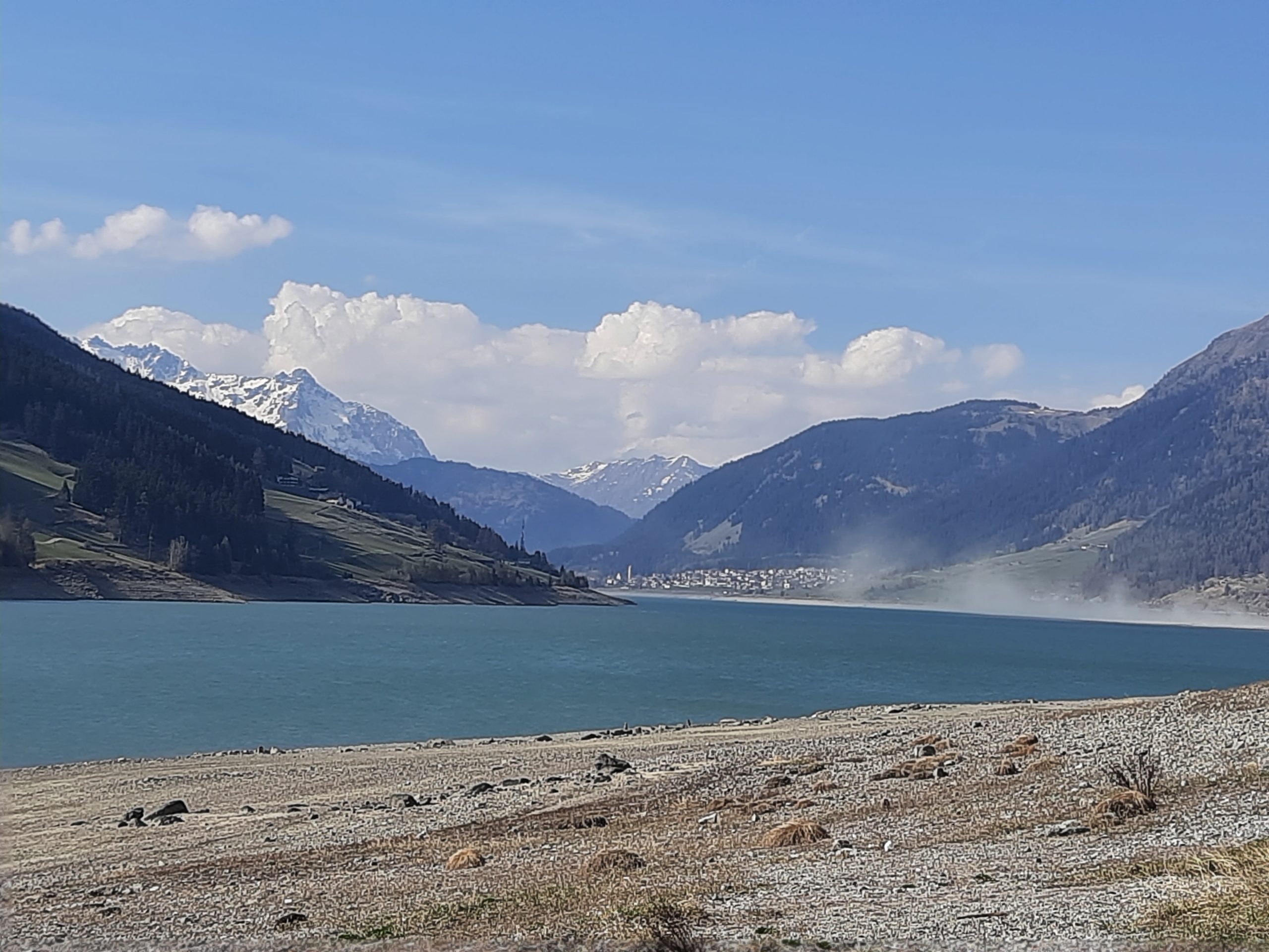 Dann ging‘s aber flott weiter – ohne Probleme – nach einen kurzen Tank-Stop vor Ried haben wir noch eine kleine Nachschub-Pause in Nauders gemacht – wegen der Pfandfreien Dosen in A und fahren nun entlang am Reschen See Richtung Süden. Es sieht aus wie in der Wüste, weil im See so wenig Wasser ist, dass der Seeboden sichtbar ist und der Wind den Staub verteilt.