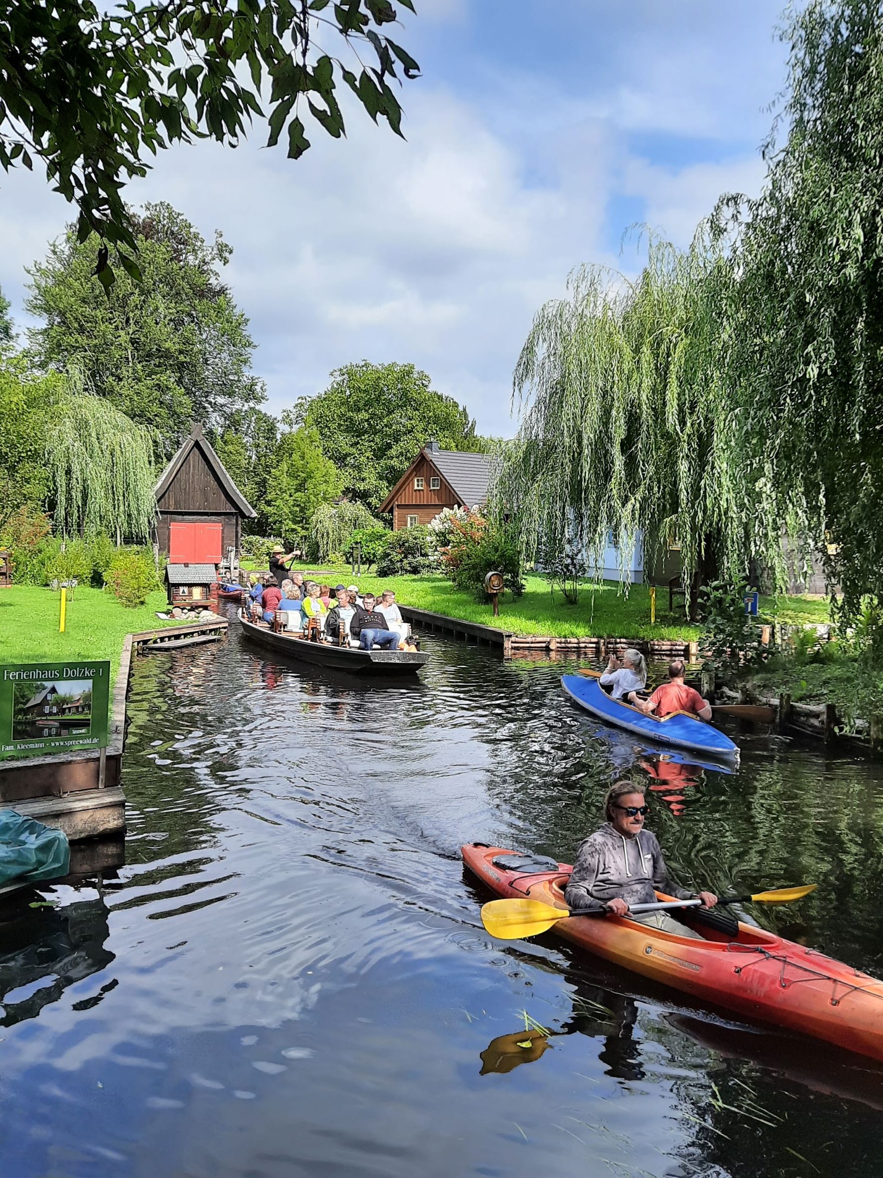 Nach dem Wolkenbruch heute nacht ist jetzt bereits wieder blauer Himmel. Wir beschließen heute eine Kahnfahrt zu machen. Die 3 Stundenfahrt nach Lehde ist genau das Richtige. Es ist eine entscheunigte Fahrt durch den Spreewald entlang an Ferienhäusern und dem letzten Bauernhof im Wald. Eine Rundfahrt durch den Ort Lehde und dann gibts eine Pause beim „Fröhlichen Hecht“. Nach einer Stunde aufenthalt kehts über den Schloßgraben wieder zurück.