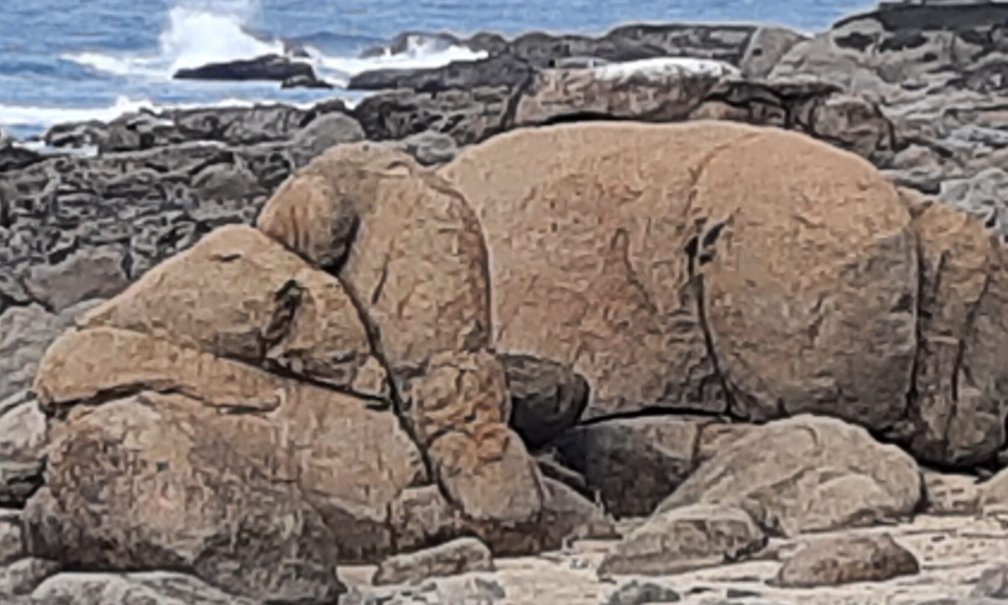 Die Steine am Strand erscheinen je nach Blickpunkt in unterschiedlichen Formen – so wie diese – die man für einen schlafenden Elefanten halten könnte.