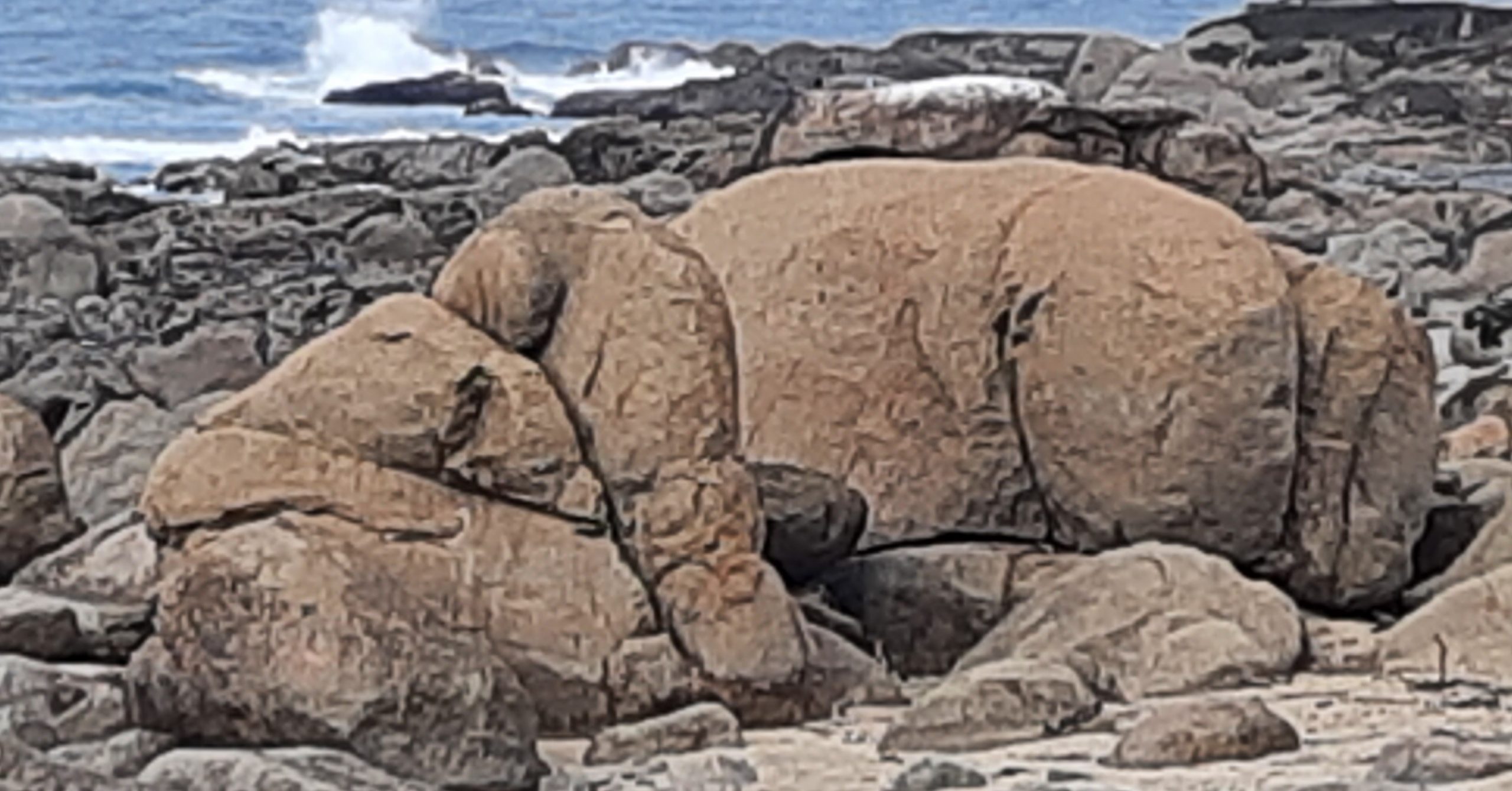 Die Steine am Strand erscheinen je nach Blickpunkt in unterschiedlichen Formen – so wie diese – die man für einen schlafenden Elefanten halten könnte.