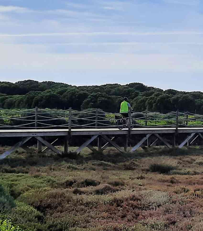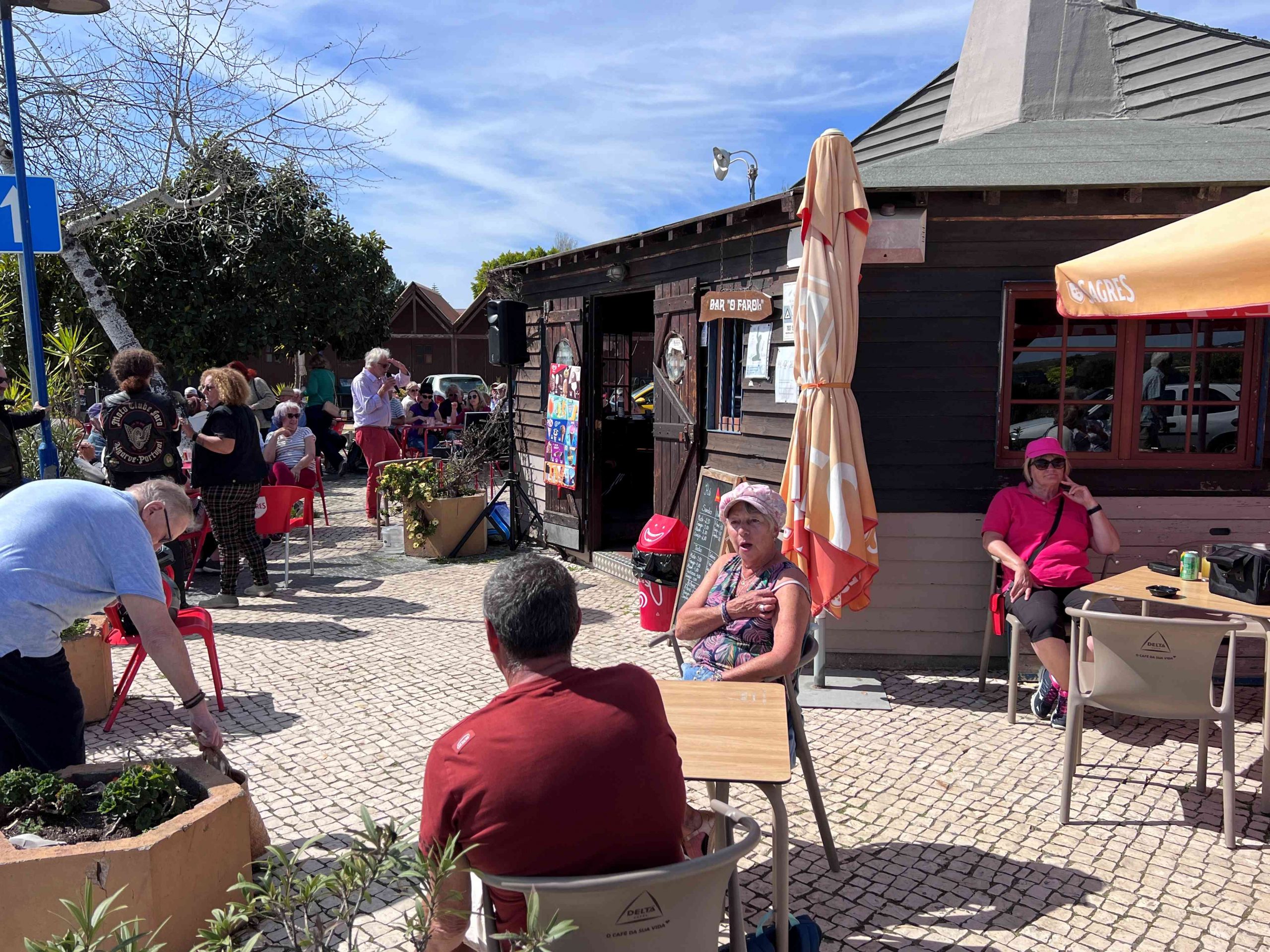 Ich habe auf der Komoot – App eine Radl-Tour von Olhao nach Tavira gefunden. Wir müßen vom Stellplatz aus ca. 5 km auf der N125 fahren und können dann rechts abbiegen und fahren immer zwischen der Eisenbahn und dem Meer. Die Tour führt meisst über Schotterwege – ist zum Teil sehrgut beschildert – aber dann auch wieder ohne jede Markierung. Unser erster Halt ist in Fuseta – dort ist heute Flohmarkt rund um den Campingplatz „Rio Formantor“ – den wir uns auch schon auf dem Papier angeschaut haben. Aber der ist proppenvoll. An der Kneipe gibt es aber Live-Musik…