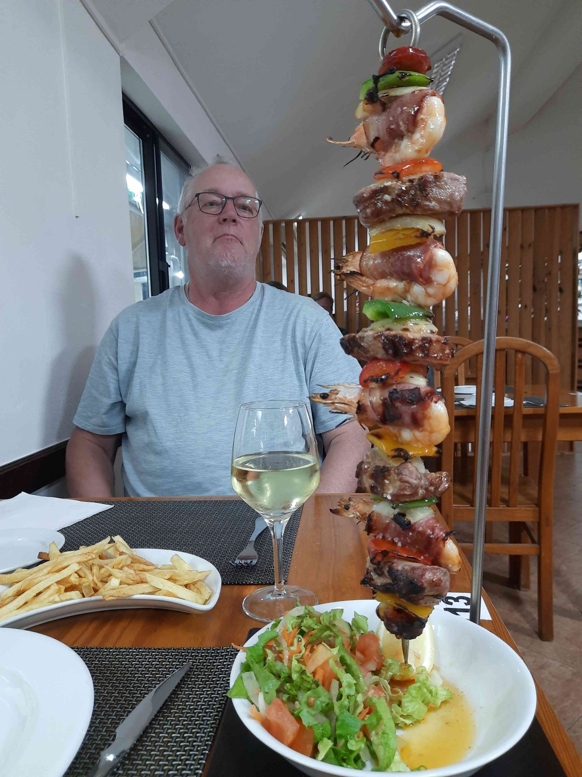 Am Abend haben wir noch den Tag in der Campingplatz – Wirtschaft ausklingen lassen . Es gab einen Spies mit Schweinefilet und in Speck eingewickelten Garnelen – sehr lecker…