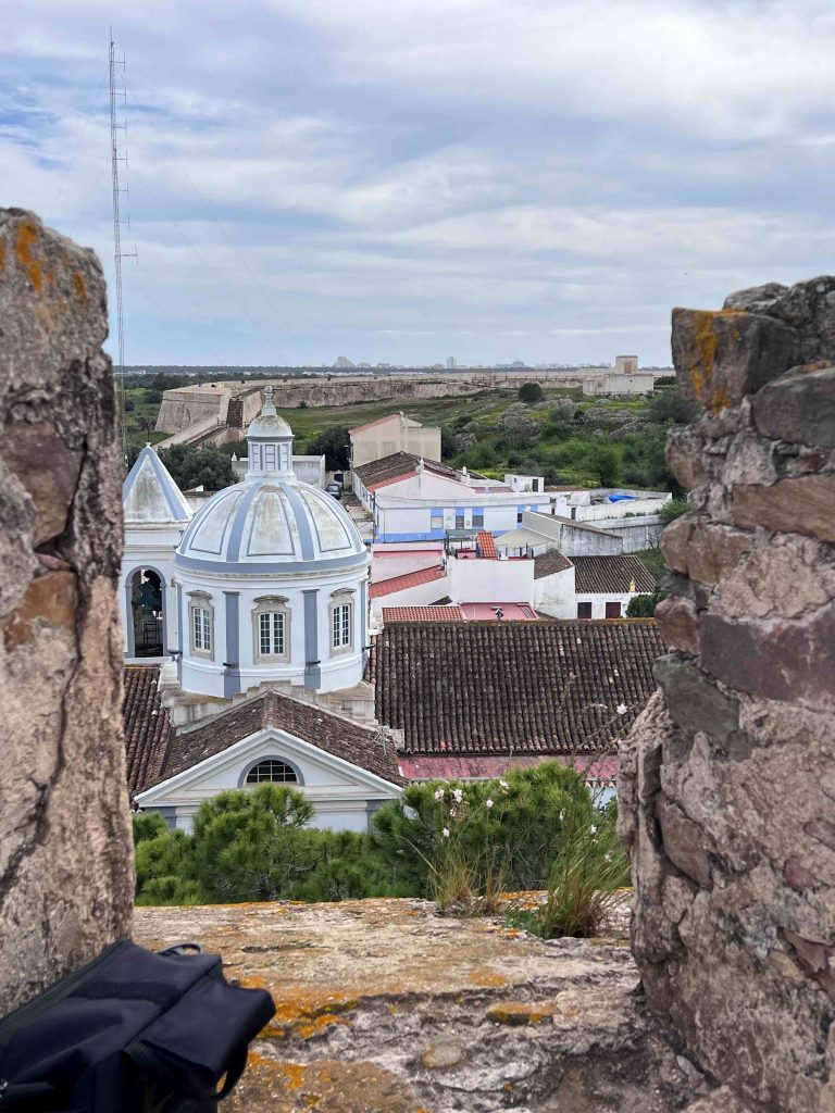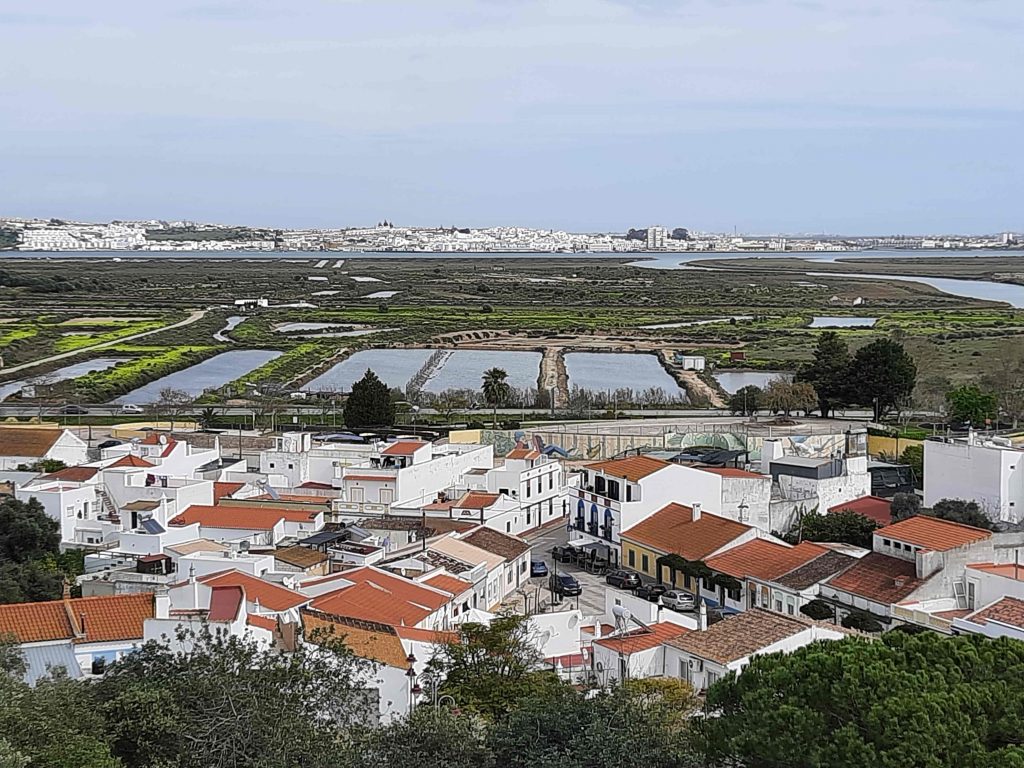 Nach Castro Marim sind es ca. 8 km. Es geht vorbei an Lidl und Aldi und dann quer durch die Salzgewinnungs – Becken nach Castro Marim. Bei der Anfahrt sieht man nur die alte Festung. Erst als wir zur Festung fahren sieht man die eigentliche Stadt und auch die Burg mit dem Schloß . Vom Weg auf der Schloßmauer sieht man auch sehr schön die Autobahnbrücke die Portugal mit Spanien verbindet.