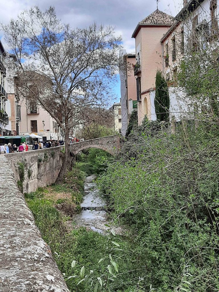 Durch die kleinen Sträßchen der Altstadt kommen wir an die „Carrera del Darro“. Das ist ein kleines, enges Sträßchen das entlang dem Rinnsal Darro unterhalb der Almabra verläuft. Das Sträßchen teilen sich 3 Buslienien, die Bimmelbahn und tausende Fußgänger in beide Richtungen.