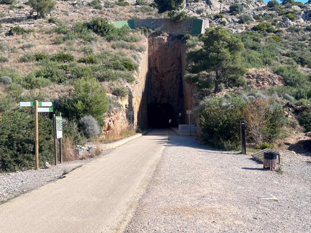 Start der Strecke ist in Benicassim am Parkplatz beim Lidl. Dann führt der Radweg um den Ort außen herum, quert die neue Bahnstrecke um dann kurz leiche aufwärtz und dann knapp 6 km fast eben nach Oropesa del Mar zu führen. Auf der Strecke treffen sich die Wanderer, Walker und Radler in beiden Richtungen. Die Strecke führt durch tiefe Einschnitte und es gibt ein unbeleuchtetes Tunnel mit ca. 500 m Länge.