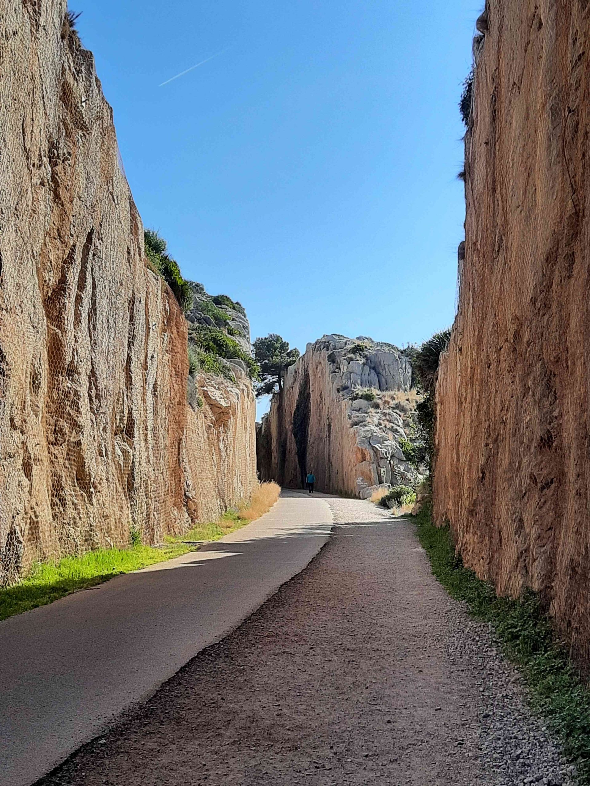 Start der Strecke ist in Benicassim am Parkplatz beim Lidl. Dann führt der Radweg um den Ort außen herum, quert die neue Bahnstrecke um dann kurz leiche aufwärtz und dann knapp 6 km fast eben nach Oropesa del Mar zu führen. Auf der Strecke treffen sich die Wanderer, Walker und Radler in beiden Richtungen. Die Strecke führt durch tiefe Einschnitte und es gibt ein unbeleuchtetes Tunnel mit ca. 500 m Länge.