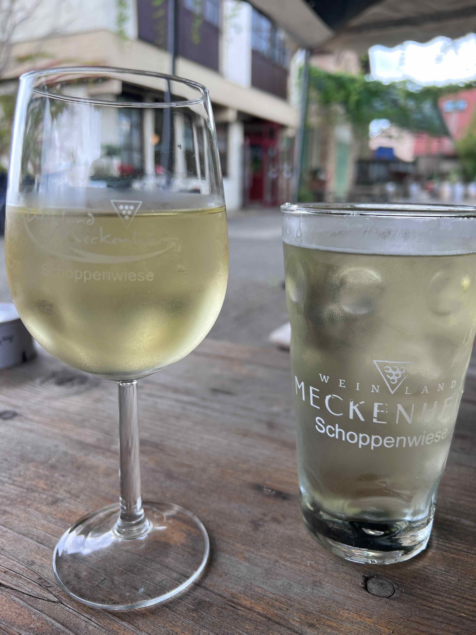 Pünktlich zum Mittagsessen sind wir wieder zurück auf der Schoppenwiese bei Spießbraten und Saumagen. An userem Tisch sitzen nette Leute und wir unterhalten uns den ganzen Nachmittag.