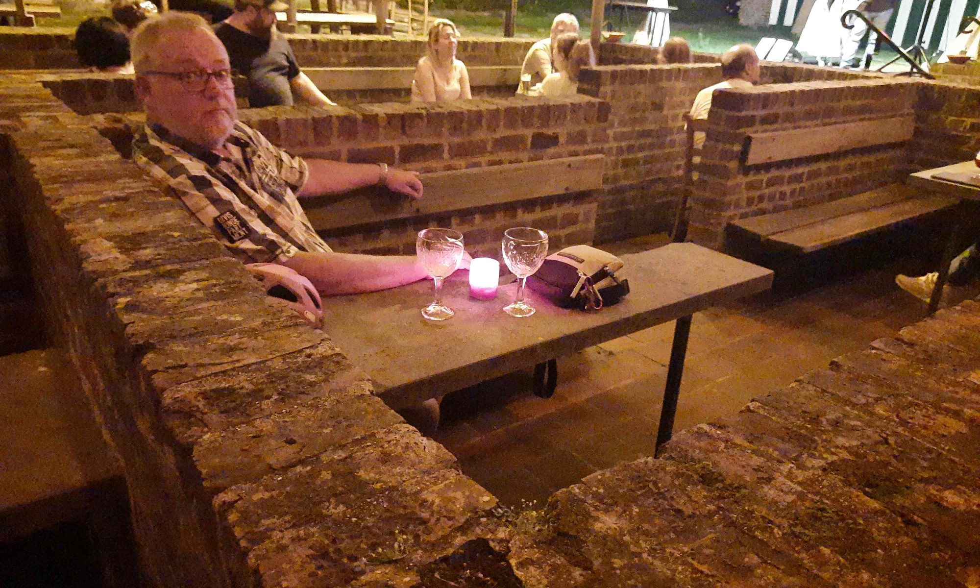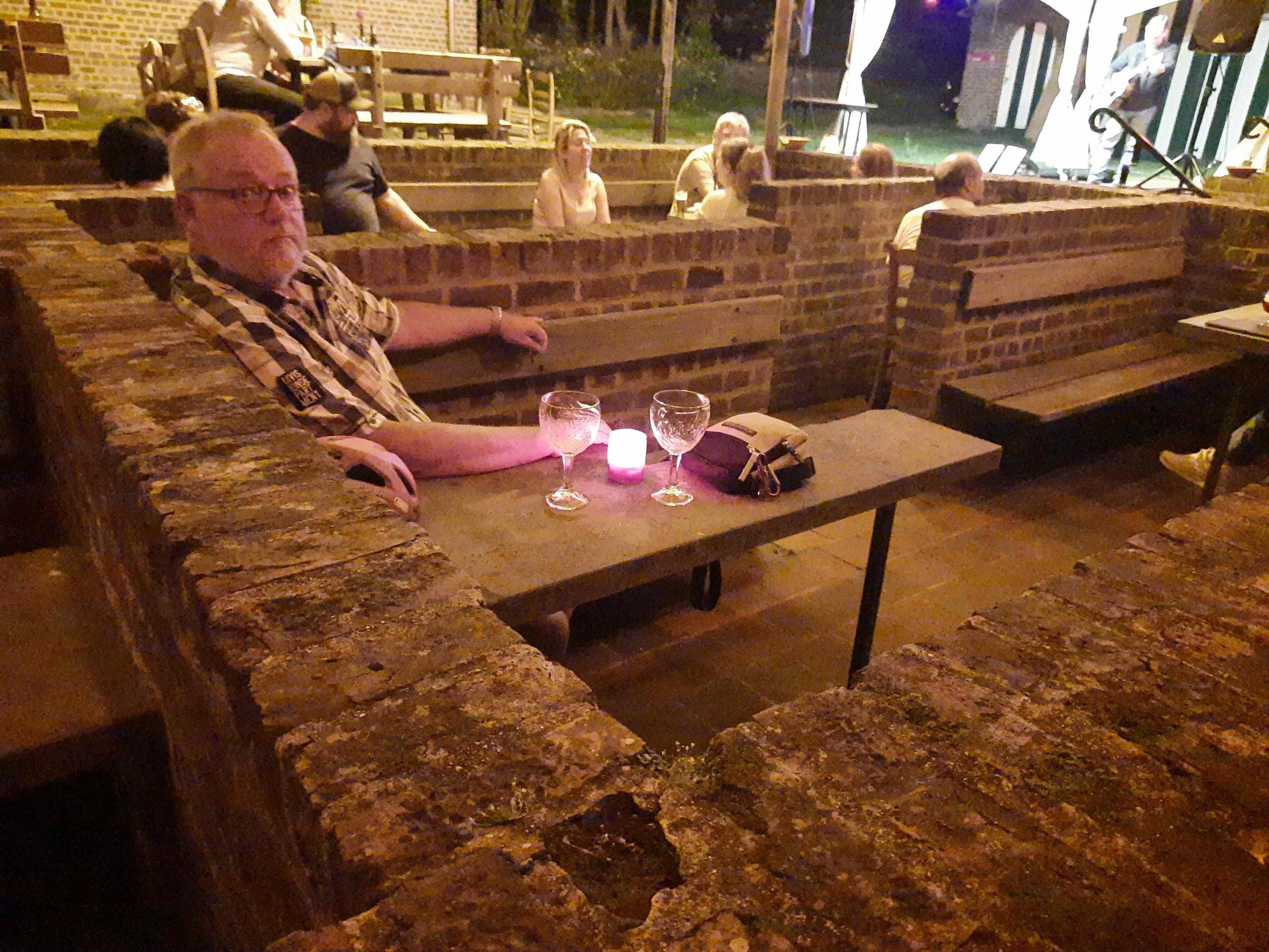 Und es war sehr stimmungsvoll und schön. Der Garten ist auf einen alten Grundriss gemauert. Die Sitze sind hart und die Tische aus Granitplatten. Und als der Abend mit einen Johnny Cash Song begonnen hat war das Eis schon gebrochen.