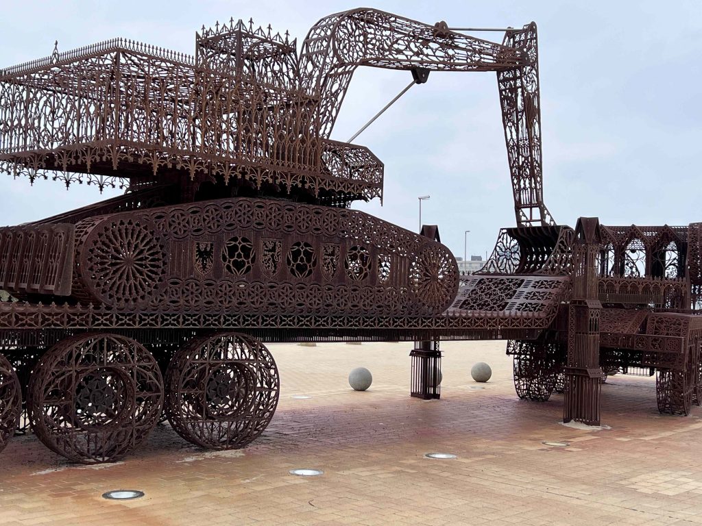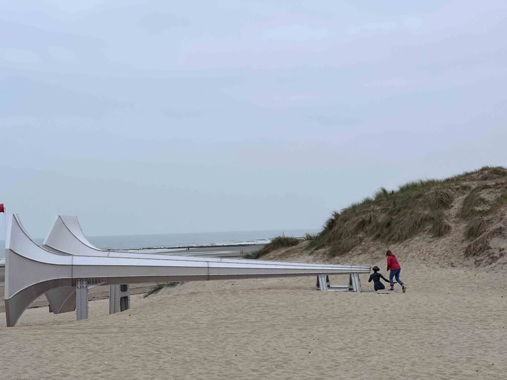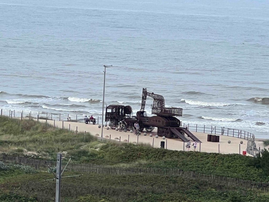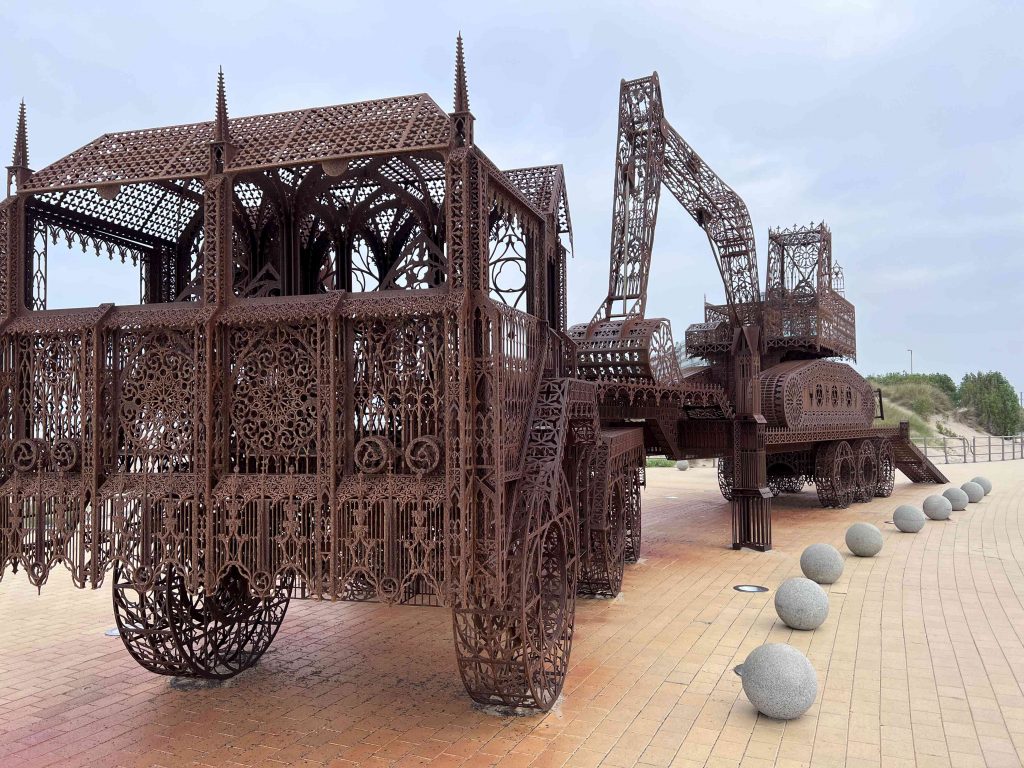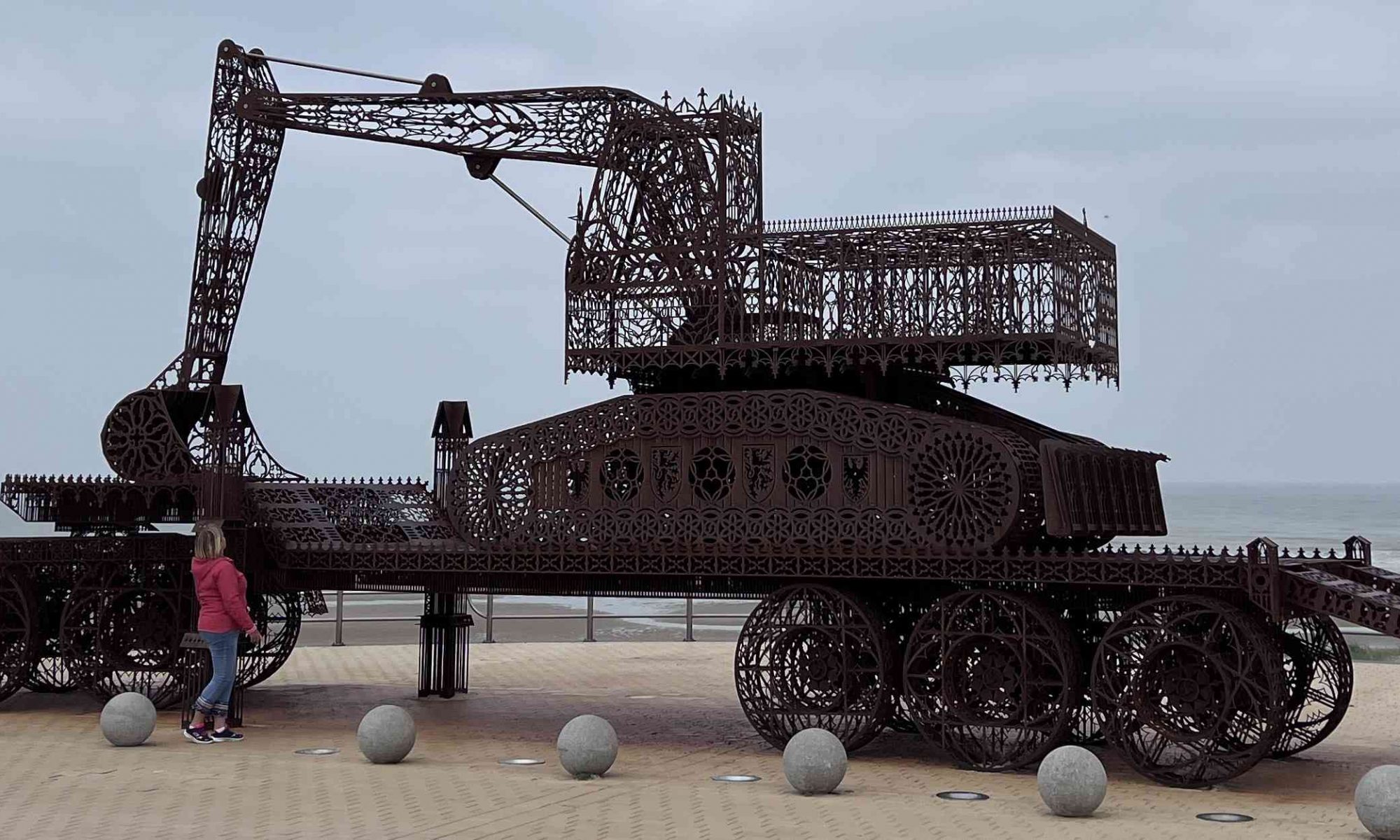 Wir fahren am Strand entlang zuerst bei Westend und dann in Middlekerke. Beide Orte haben eine Kilometerlange Hochhauszeile zwischen Straßenbahngleis und Strand mit einer sehr breiten Promenade. Dieser Abschnitt ist übersäht mit Kunstwerken. Das beginnt mit dem Bagger auf einem Tieflader, geht über zu riesigen Trichtern und endet dann mit Statuen der belgischen Comix – Figuren von denen wir aber die meisten nicht kennen.