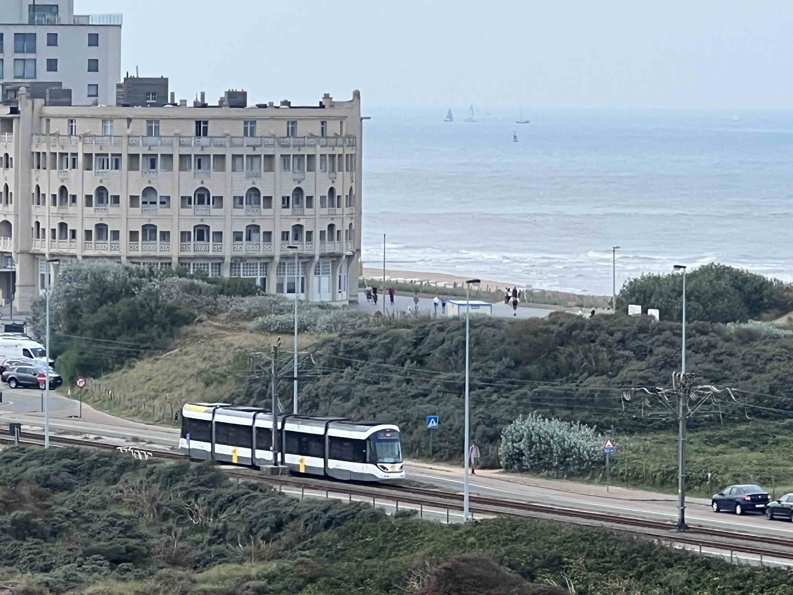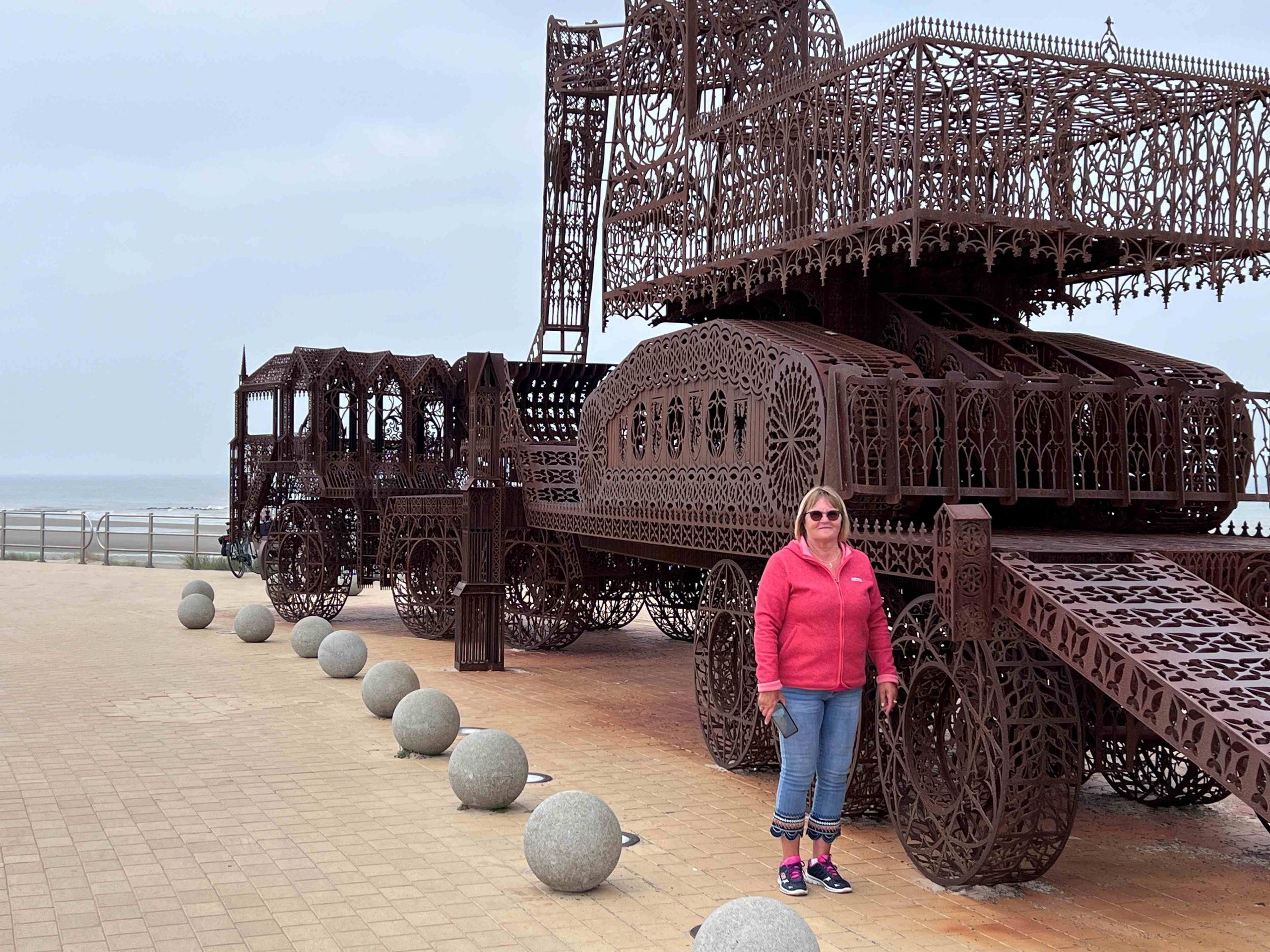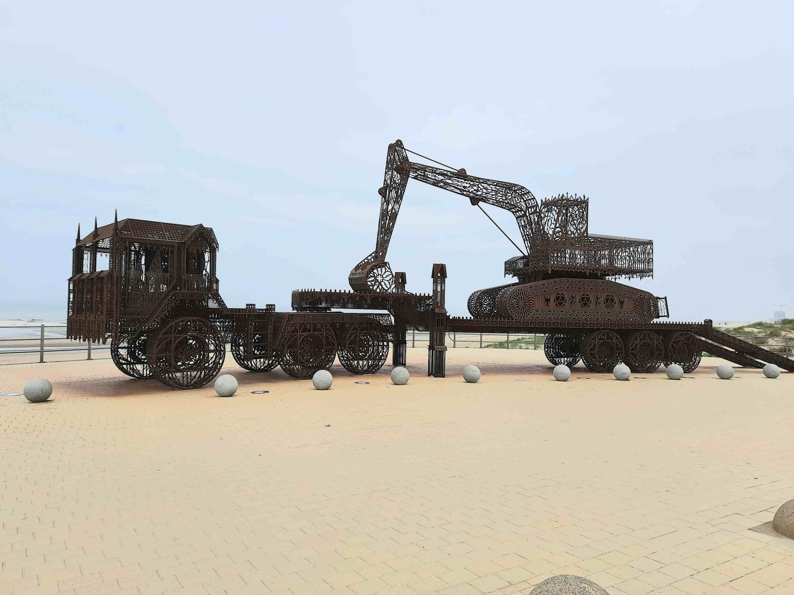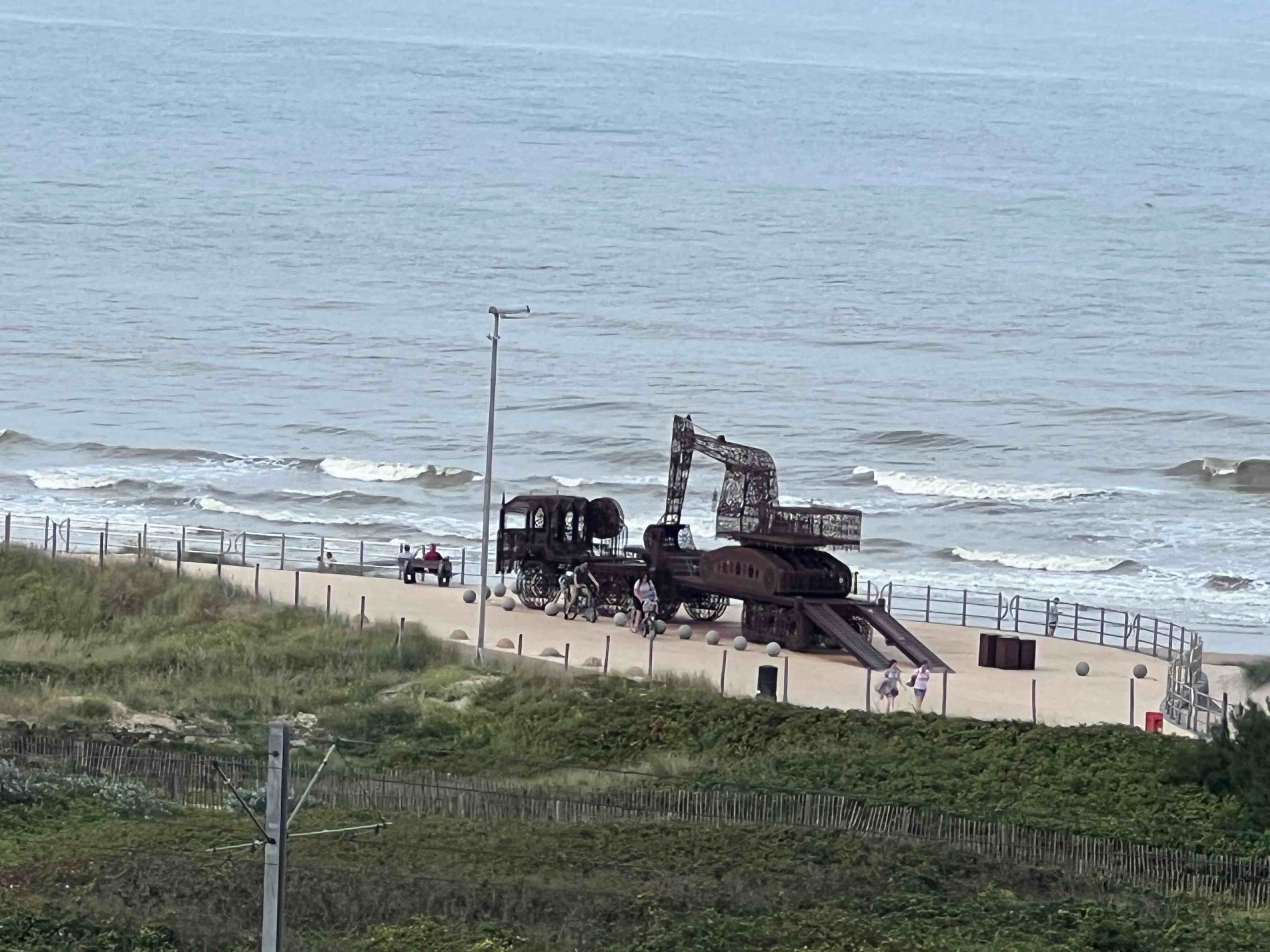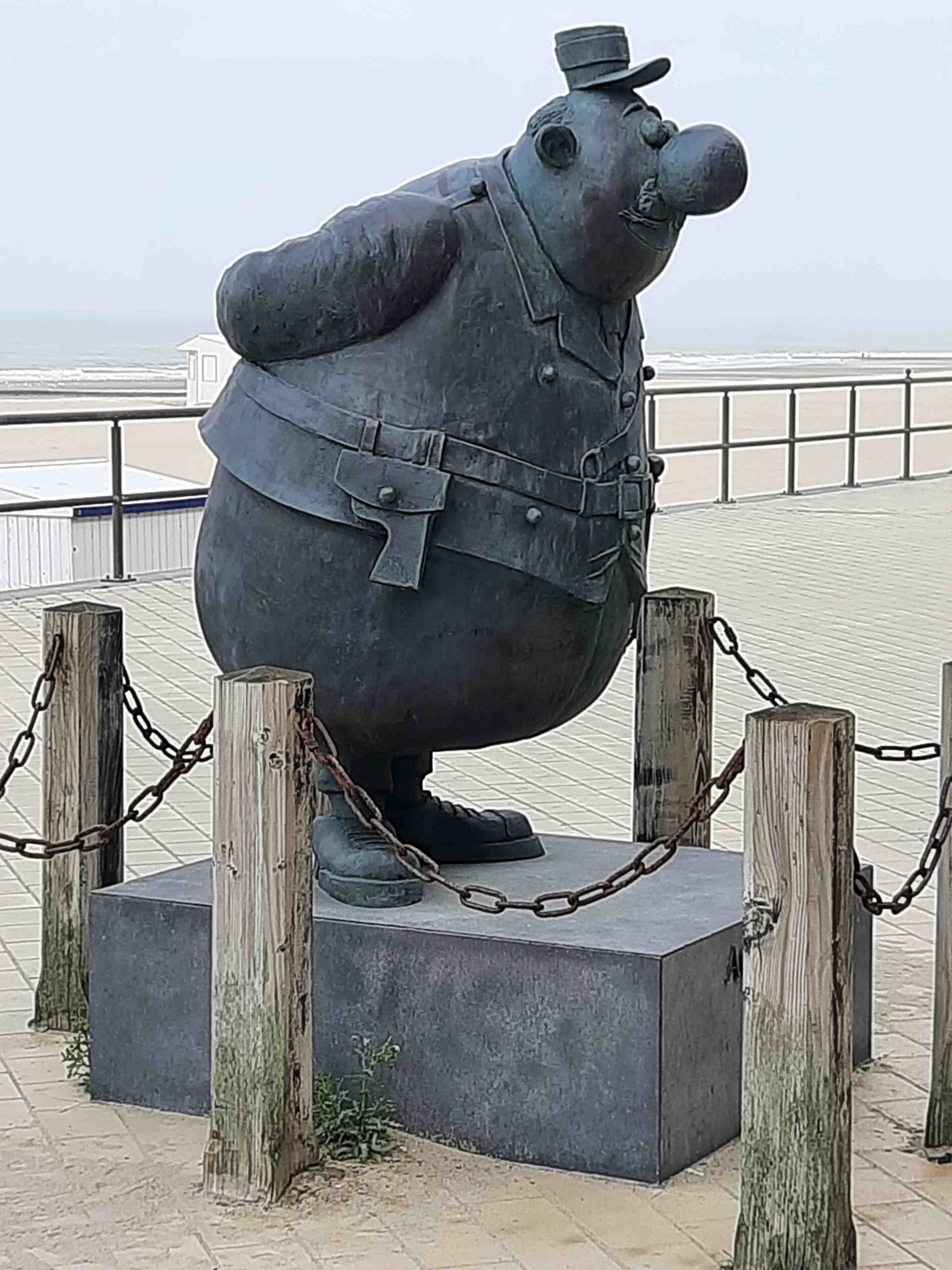 Wir fahren am Strand entlang zuerst bei Westend und dann in Middlekerke. Beide Orte haben eine Kilometerlange Hochhauszeile zwischen Straßenbahngleis und Strand mit einer sehr breiten Promenade. Dieser Abschnitt ist übersäht mit Kunstwerken. Das beginnt mit dem Bagger auf einem Tieflader, geht über zu riesigen Trichtern und endet dann mit Statuen der belgischen Comix – Figuren von denen wir aber die meisten nicht kennen.