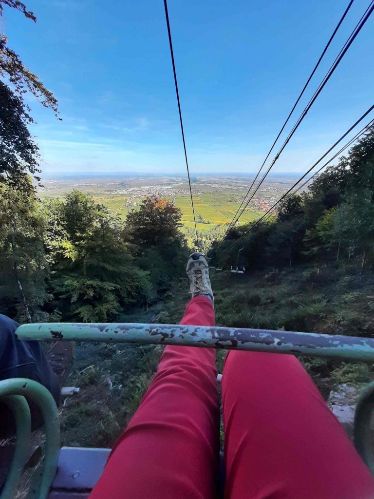 In Edenkopen gibt es eine Seilbahn. Ein Doppelsessellift bringt uns von der Ludwigshöhe auf die Burgruine Riedtburg. Hier ist die Aussicht fast noch schöner und es gibt einen Gaststätte mit gutem Kaffee und und sooo großen Kuchenstücken.