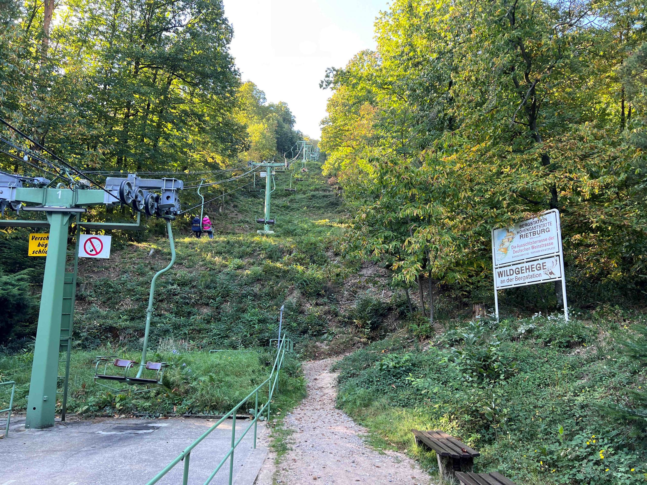 In Edenkopen gibt es eine Seilbahn. Ein Doppelsessellift bringt uns von der Ludwigshöhe auf die Burgruine Riedtburg. Hier ist die Aussicht fast noch schöner und es gibt einen Gaststätte mit gutem Kaffee und und sooo großen Kuchenstücken.