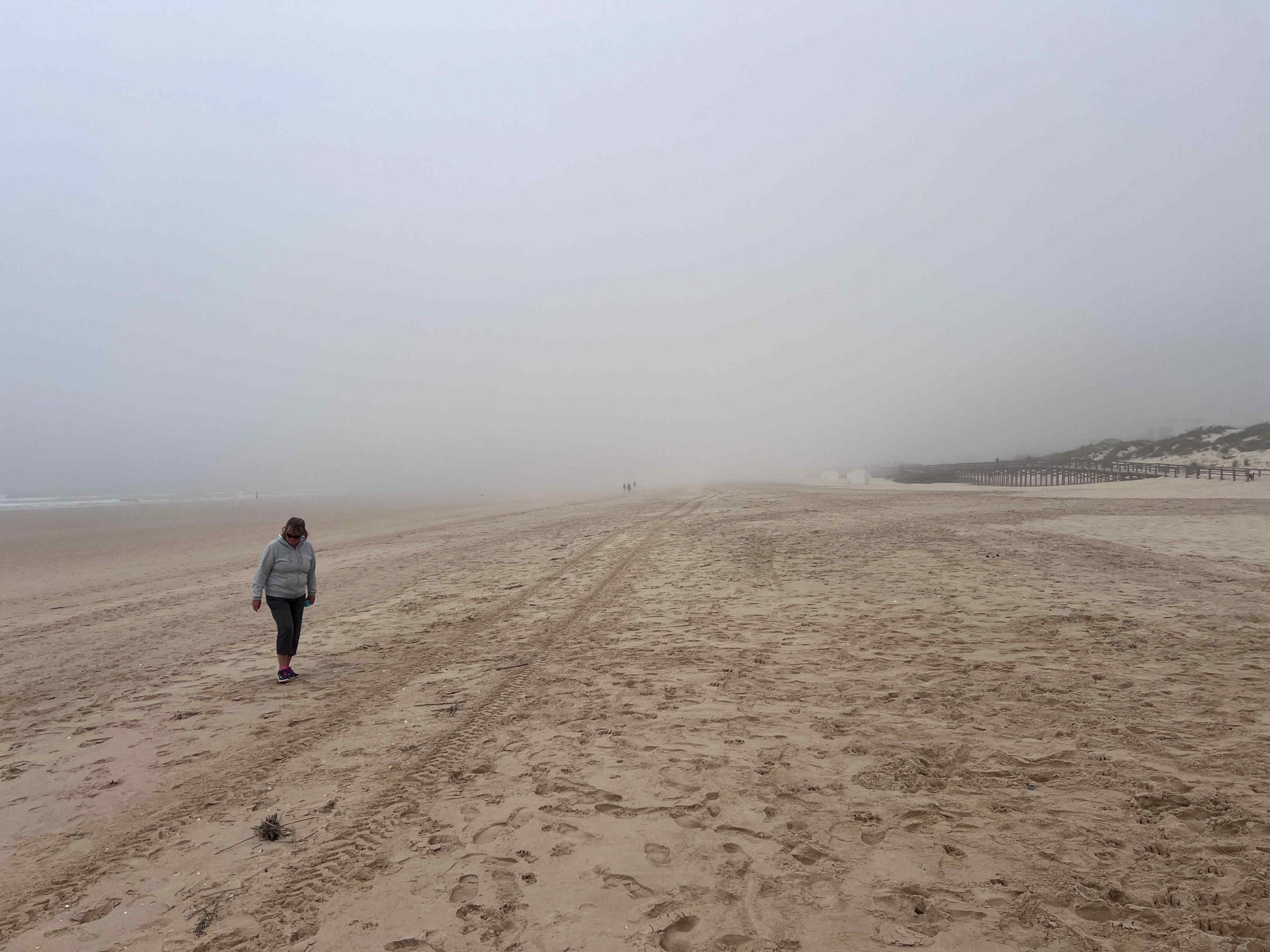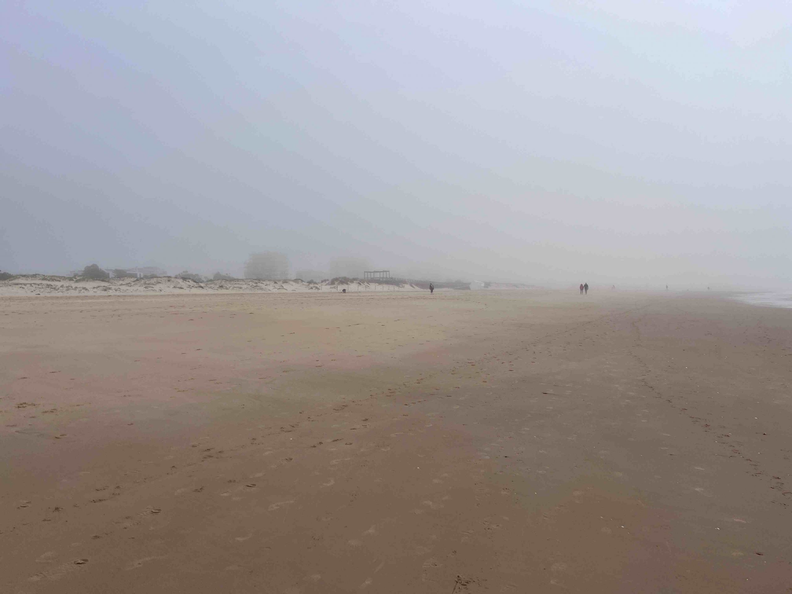 Heute morgen erlebten wir eine weiter Überraschung am Strand. Normalerweise reicht der Blick nach rechts und links bis zum Horizont. Heute aber gab es einen richtig dicken Nebel. Man konnte noch nicht einmal die obersten Etagen der Häuser sehen.