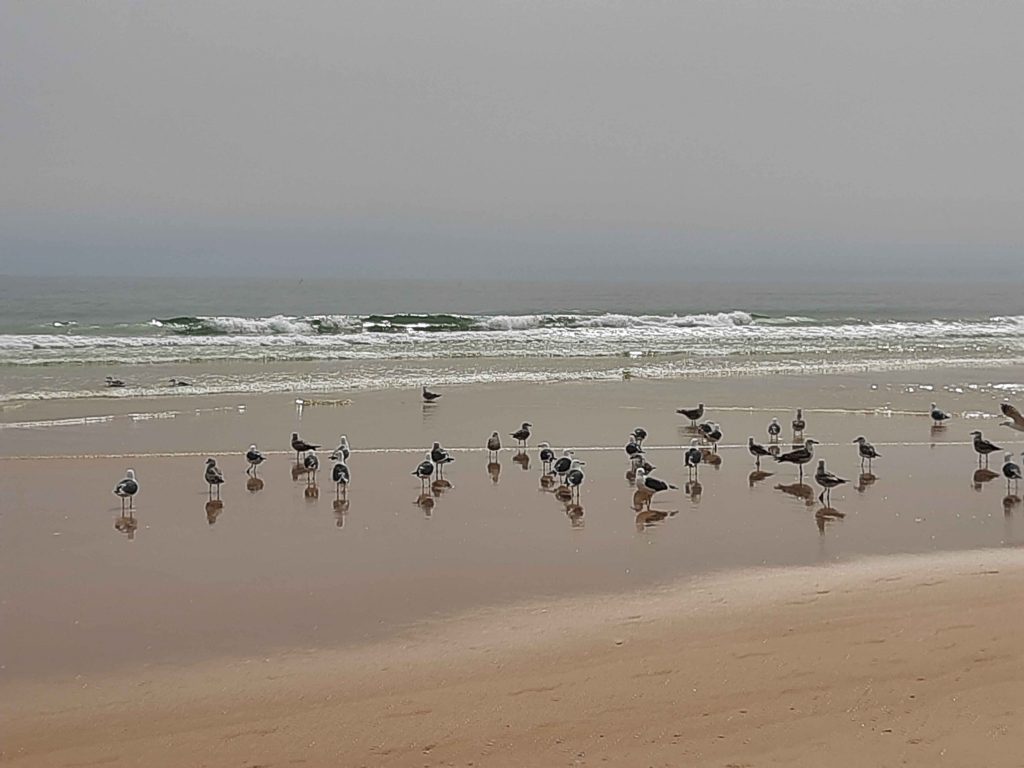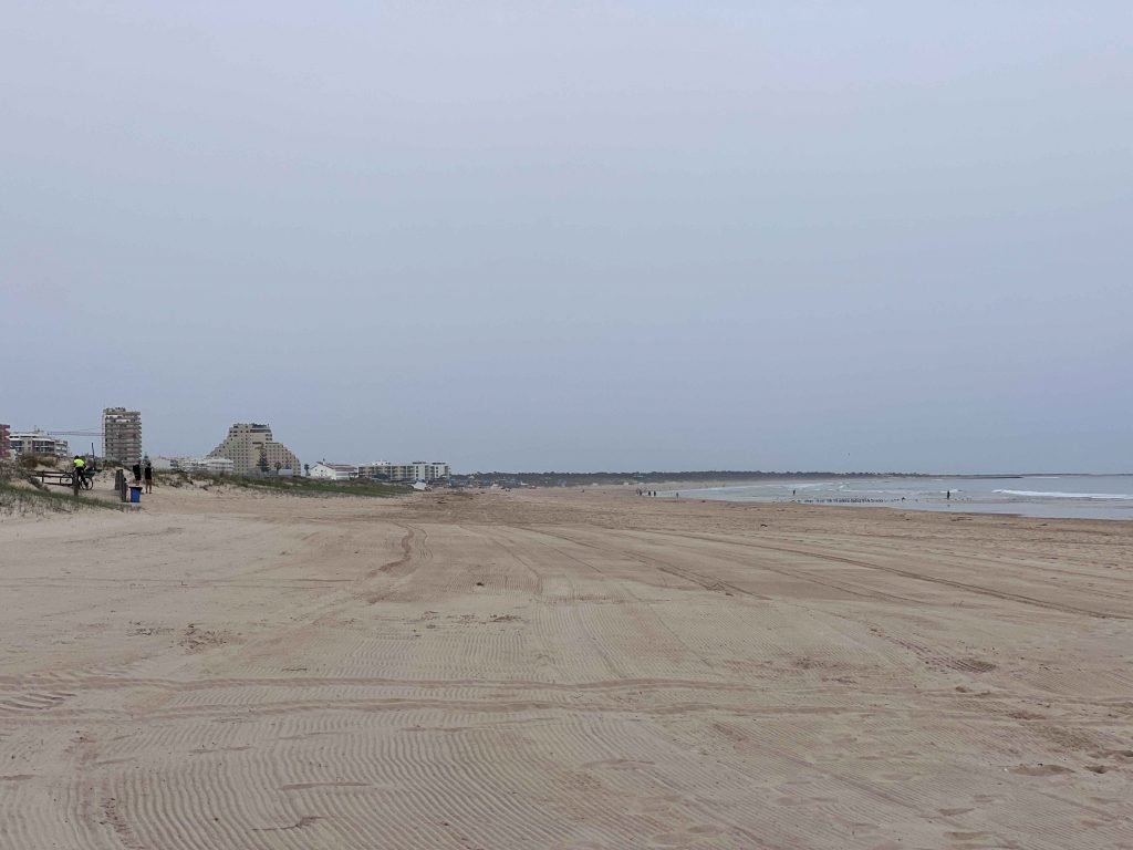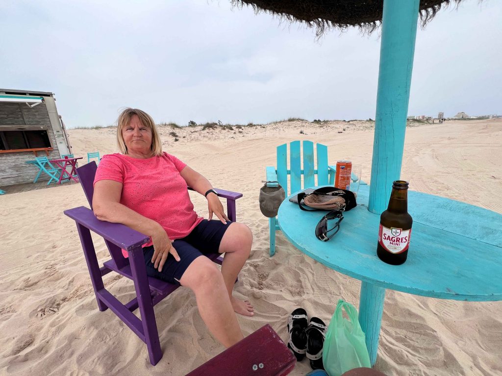 Der Strandspaziergang ging fast bis zum Sem Espinho. Kurz davor gibt es noch eine kleine Bar an der wir einkehrten. Bis wir unsere Getränke hatten lag der Hund bereits neben unseren Stühlen und hatte etwas Blaues im Mund. Der hat einfach eine meiner Socken aus dem Schuh geholt und wollte damit spielen. Erst der Besitzer hat in dazu überreden können mit meine Socke wiederzugeben.