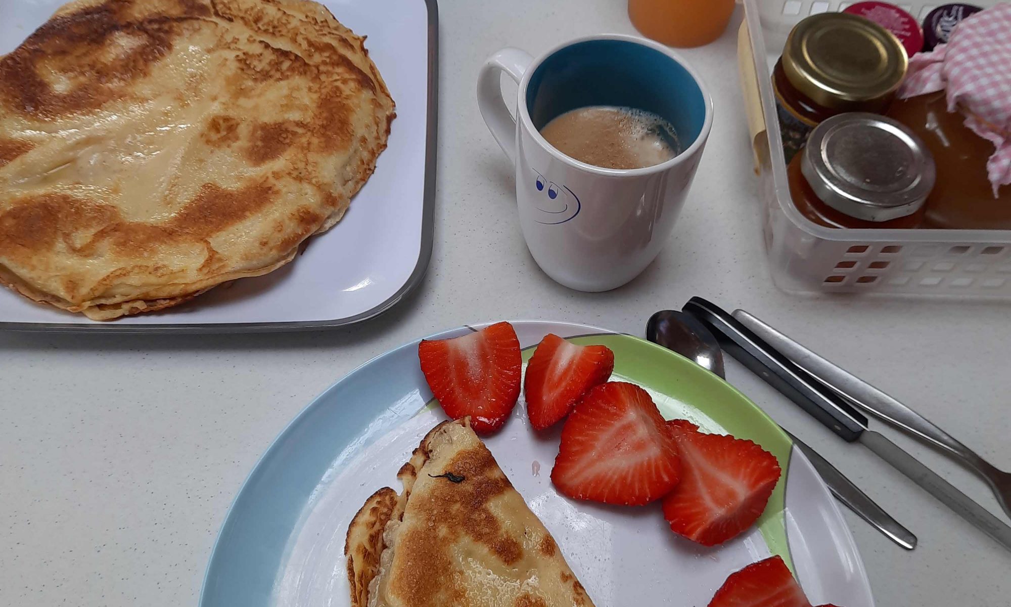 Heute ging der Tag sehr gut los. Es gab die Erdbeeren die wir gestern am Markt gekauft haben und dazu Pfannkuchen.