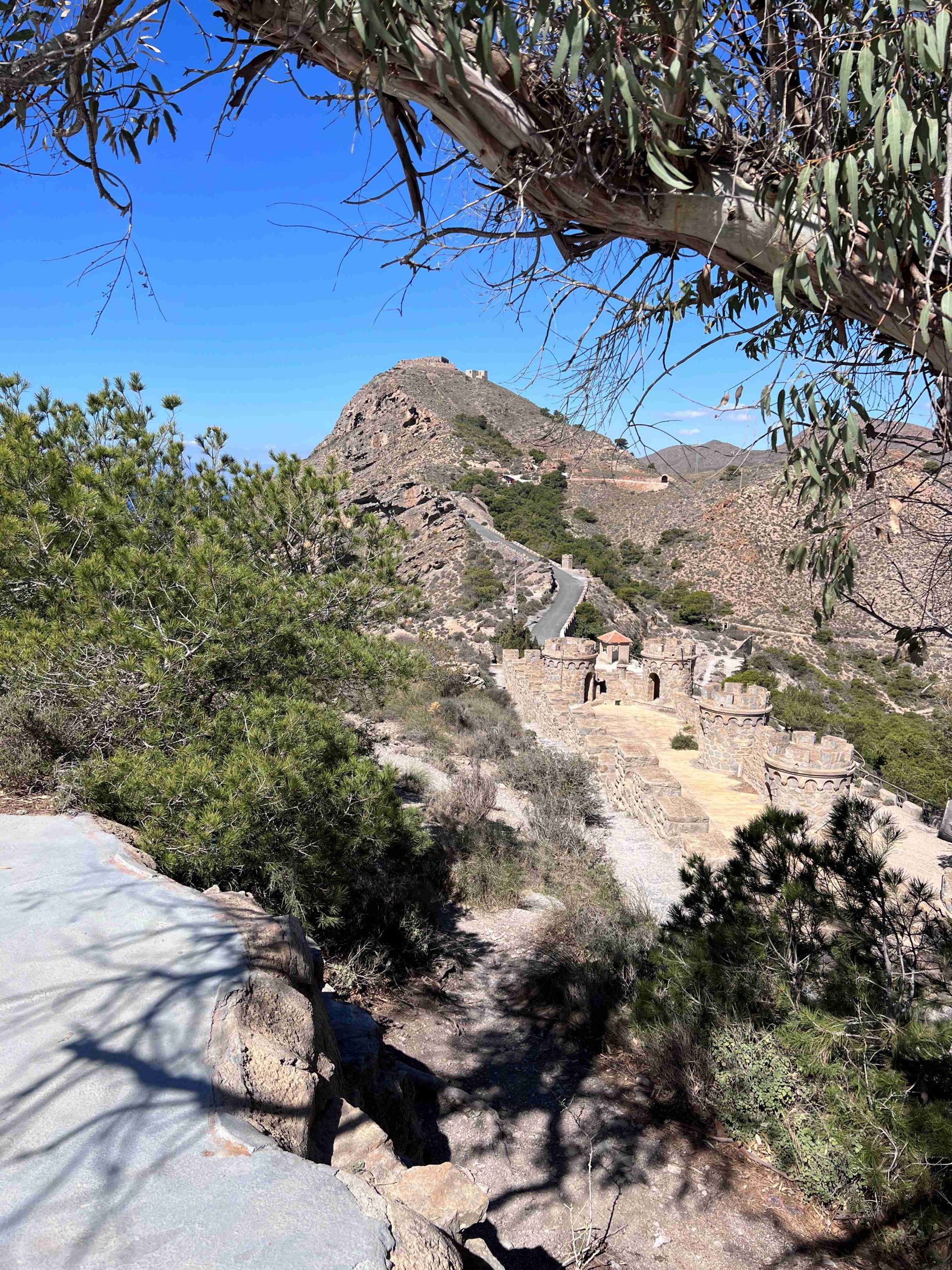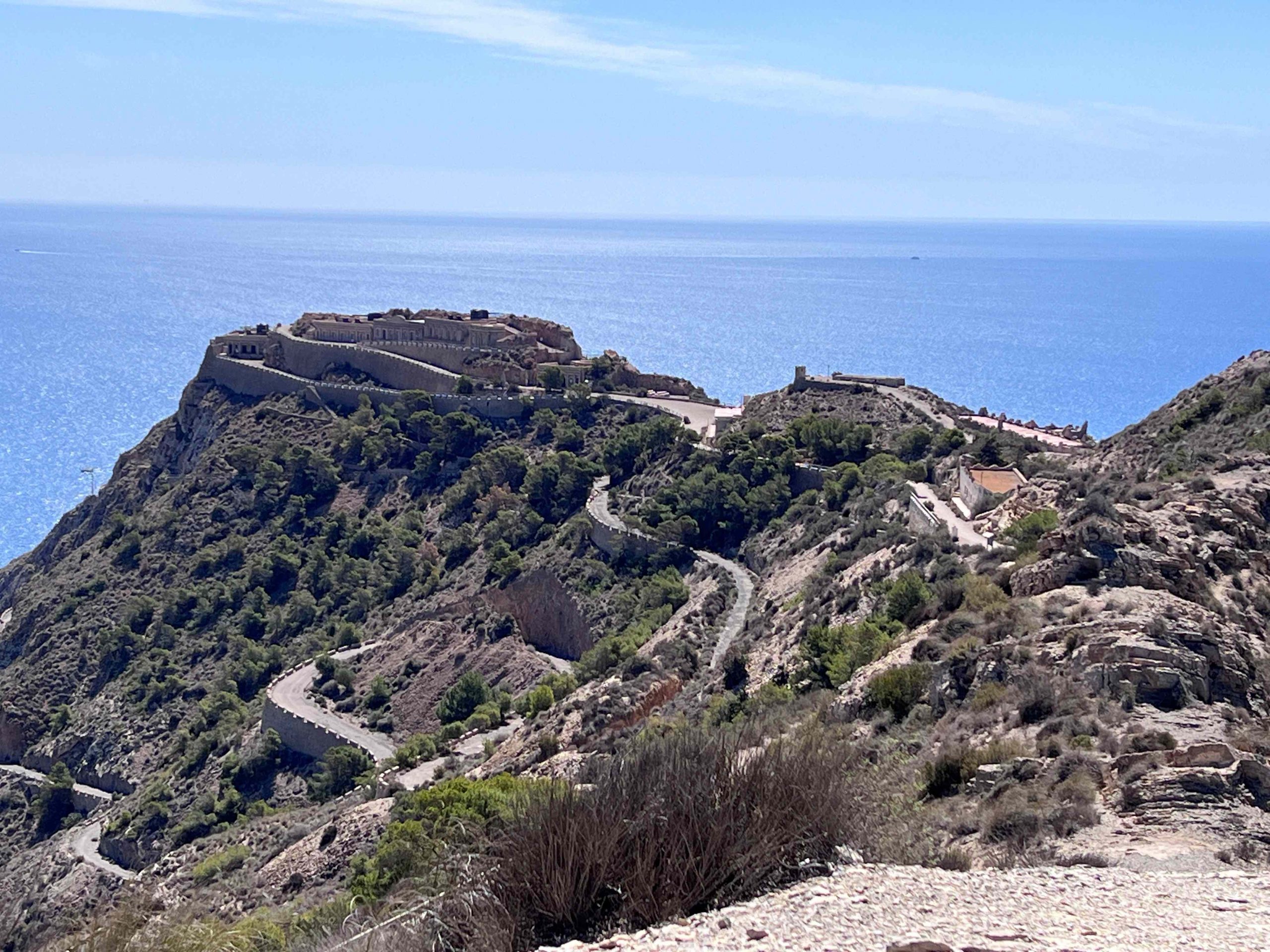 Zurück – 500 m Bergab – zur Abzweigung geht es weiter zu den Batterien die dort in den 1930-ger Jahre erbaut wurden. Auf dem Wege dorthin haben wir immer wieder einen tollen Ausblick – besonders nach links hin auf Cartagena .