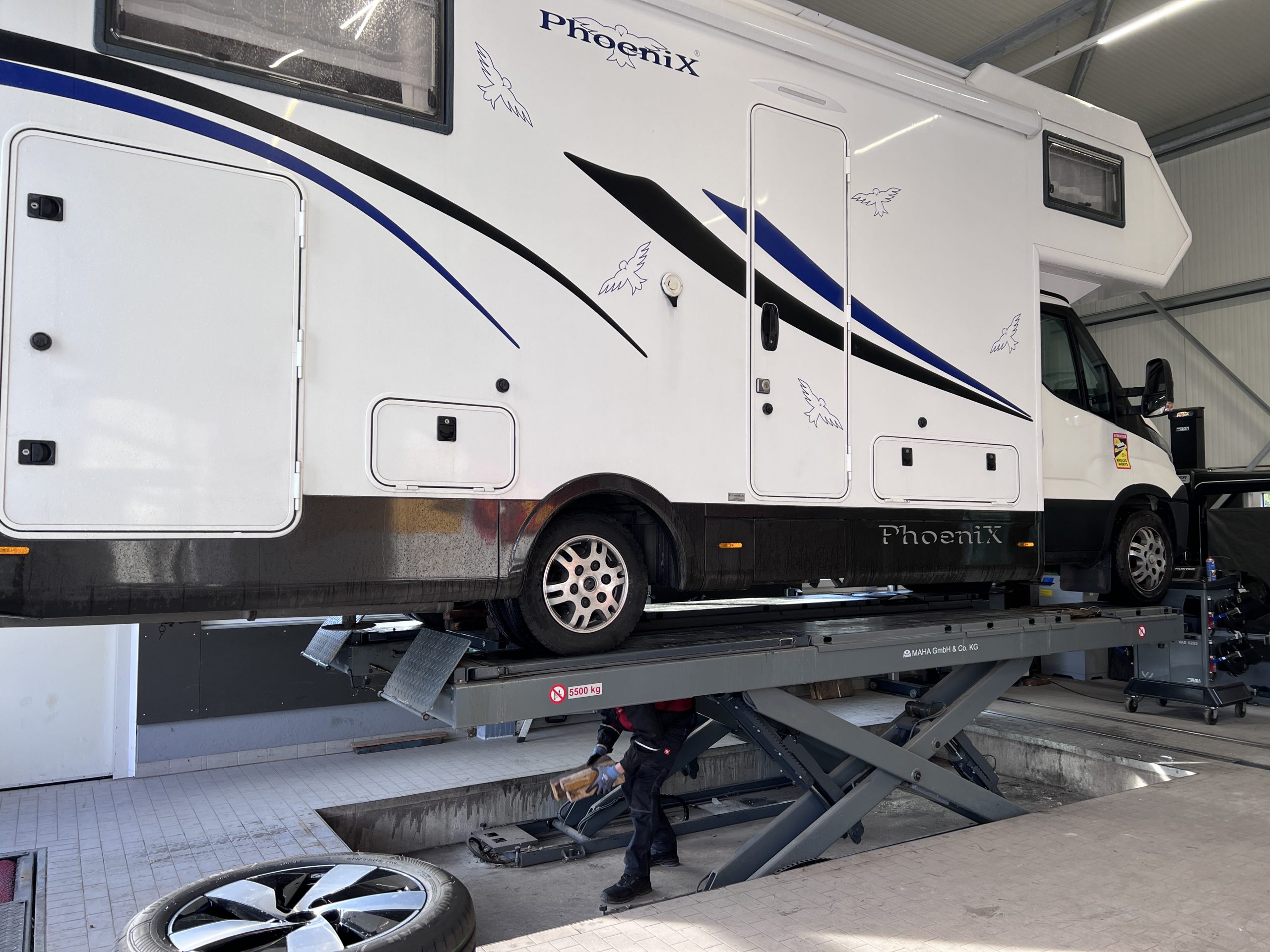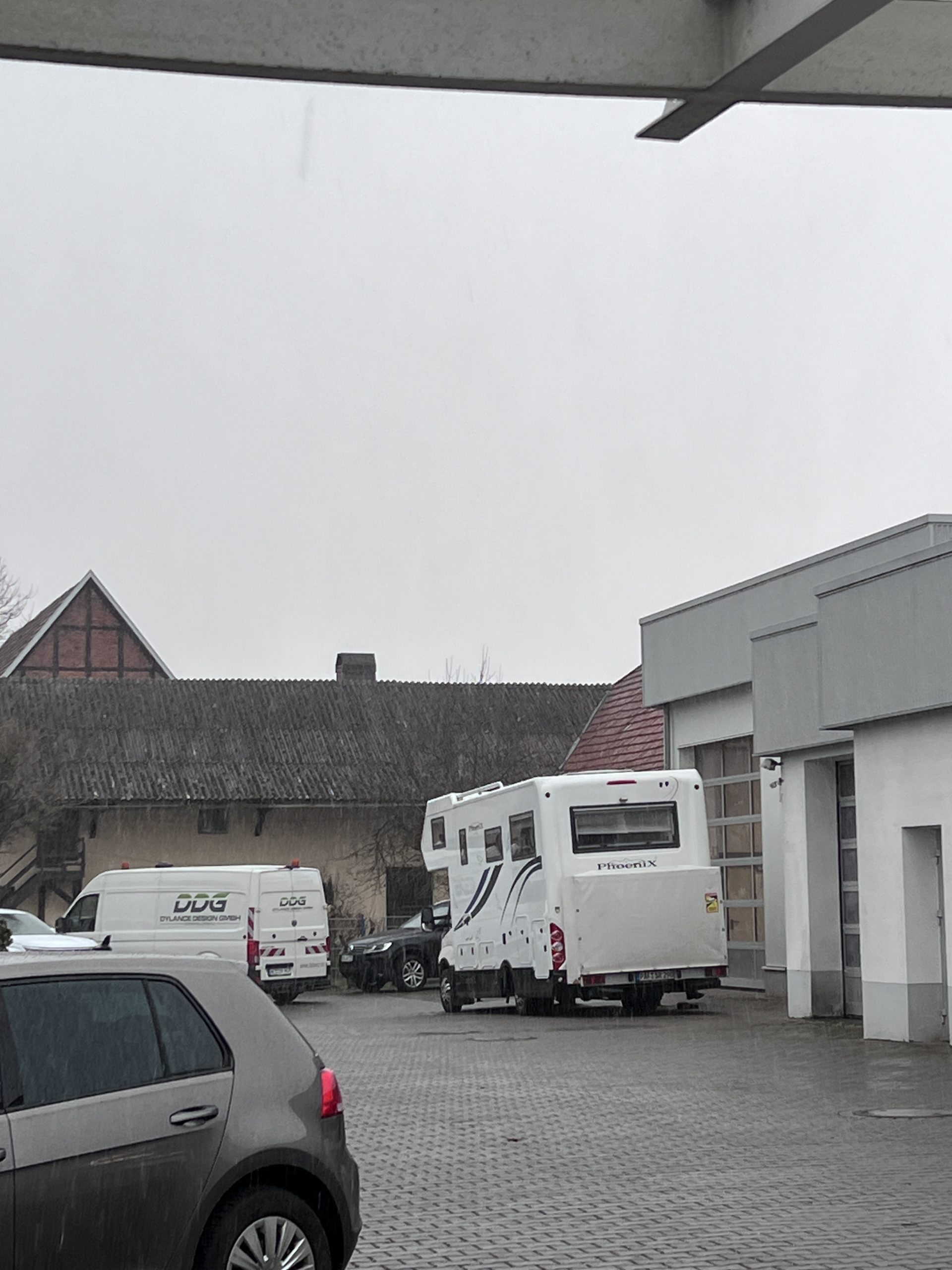 Sind die Reifen da? – Ja – Wir haben bei der Fa. Hölzner nachgefragt. Die Reifen sind heute gekommen und um 13:30 werden unsere Reifen erneut mit Luft befüllt und wir fahren die 200 m zur Werkstatt. Dort kommt der Wagen auf die Hebebühne und los gehts. Grund für den Platten sind die Ventiele. Aber nach 3 Stunden rollt Ecke-Schnecki wieder aus der Halle und der Meister macht eine Probefahrt – Alles OK. Wir verabschieden uns und machen uns auf den Heimweg. Um kurz nach 8 Uhr sind wir wieder zuhause – Puh!