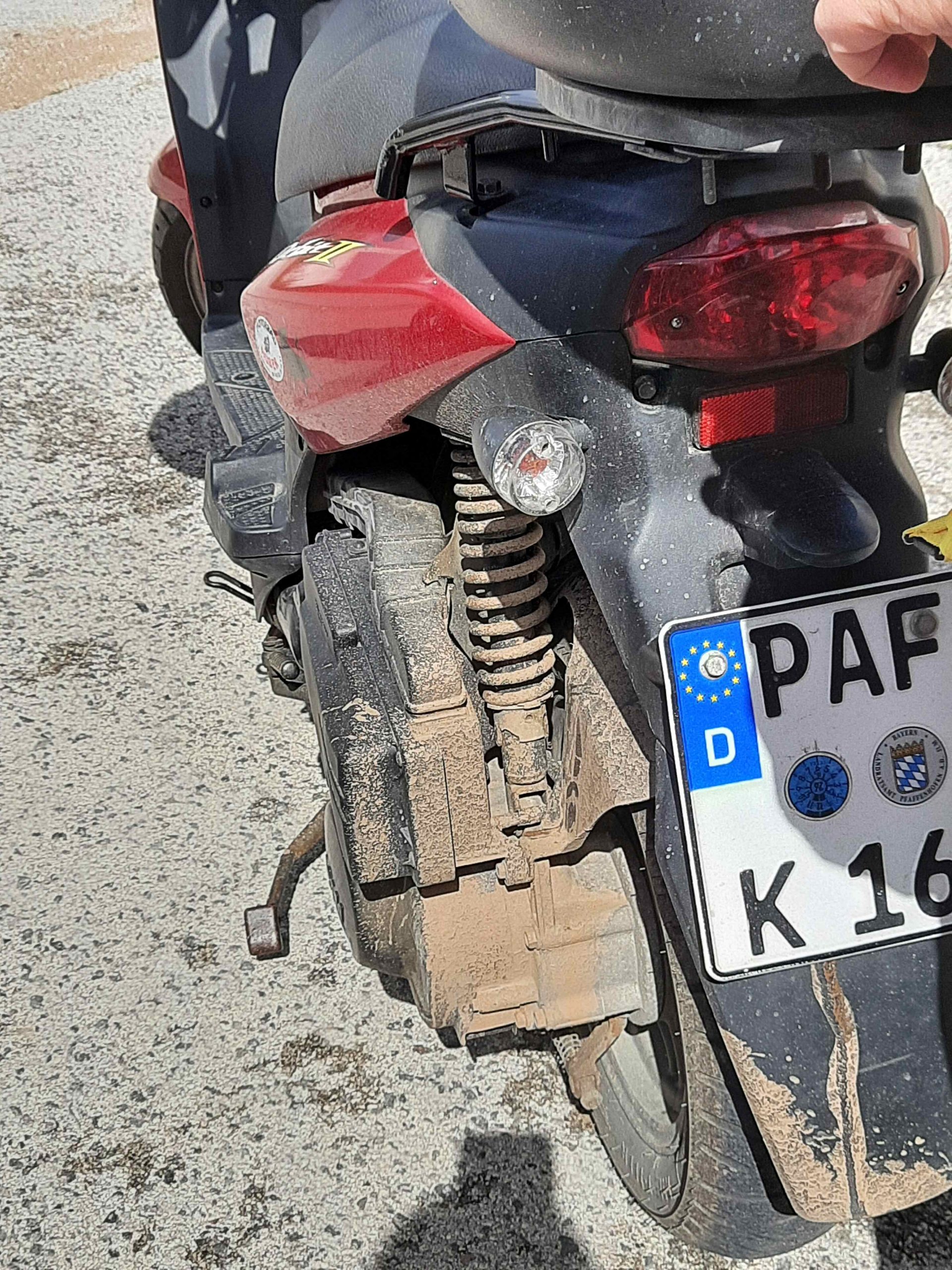 Jetzt braucht der Roller eine Wäsche weil wir entlang des Flusses im Überschwemmungs