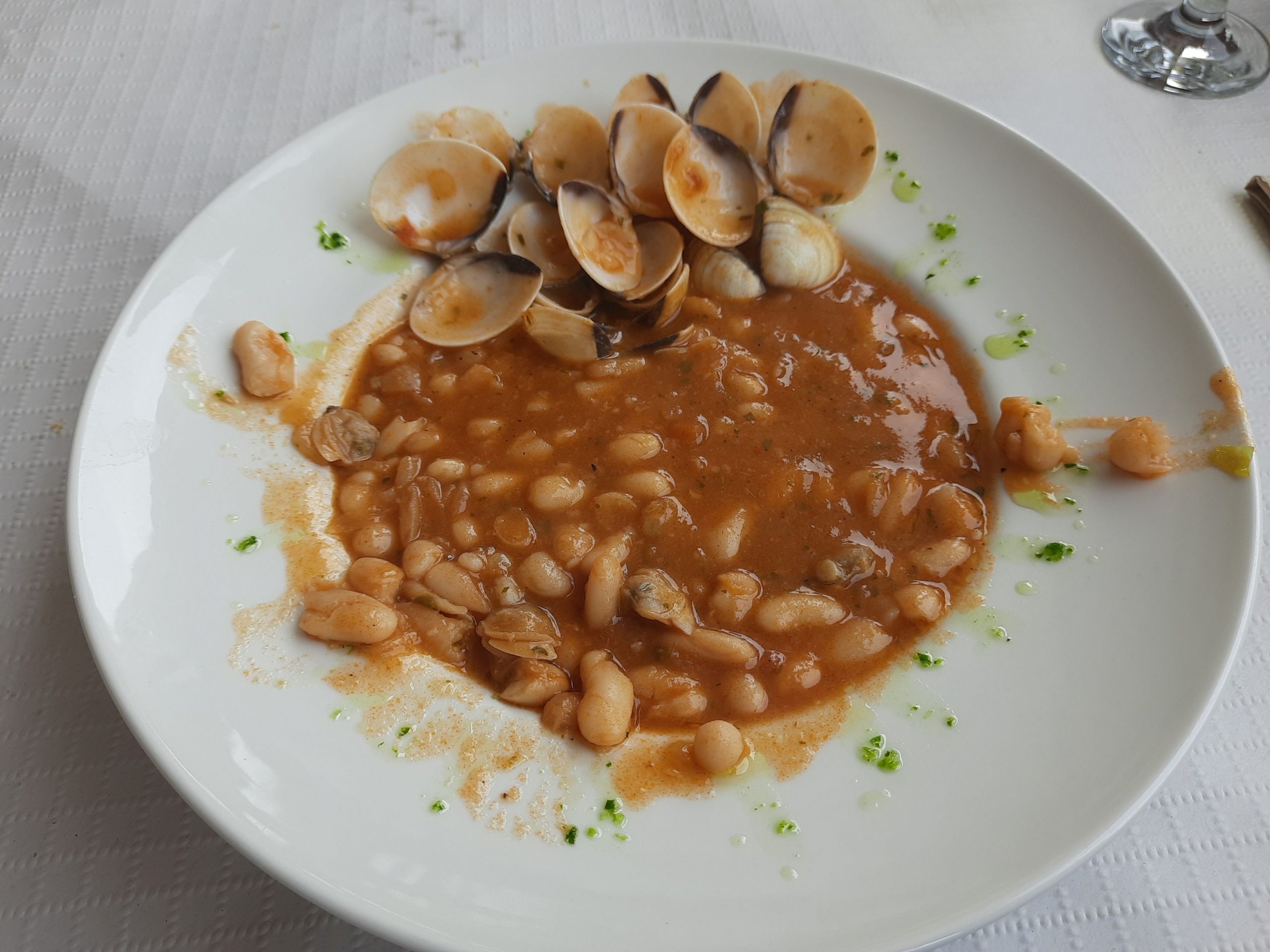 Aber der Wind lädt nicht zum Sonnenbaden ein. Nach 2 Stunden fahren wir wieder zurück und gehen in die CP Wirtschaft zum Essen. Das Tagesmenü kostet 14,90 Euro. Es gibt Salat, kleine Fische, Bohnen mit Muscheln, Rinder Wangen, Bacalhau, Espresso und eine Flasche Wein.