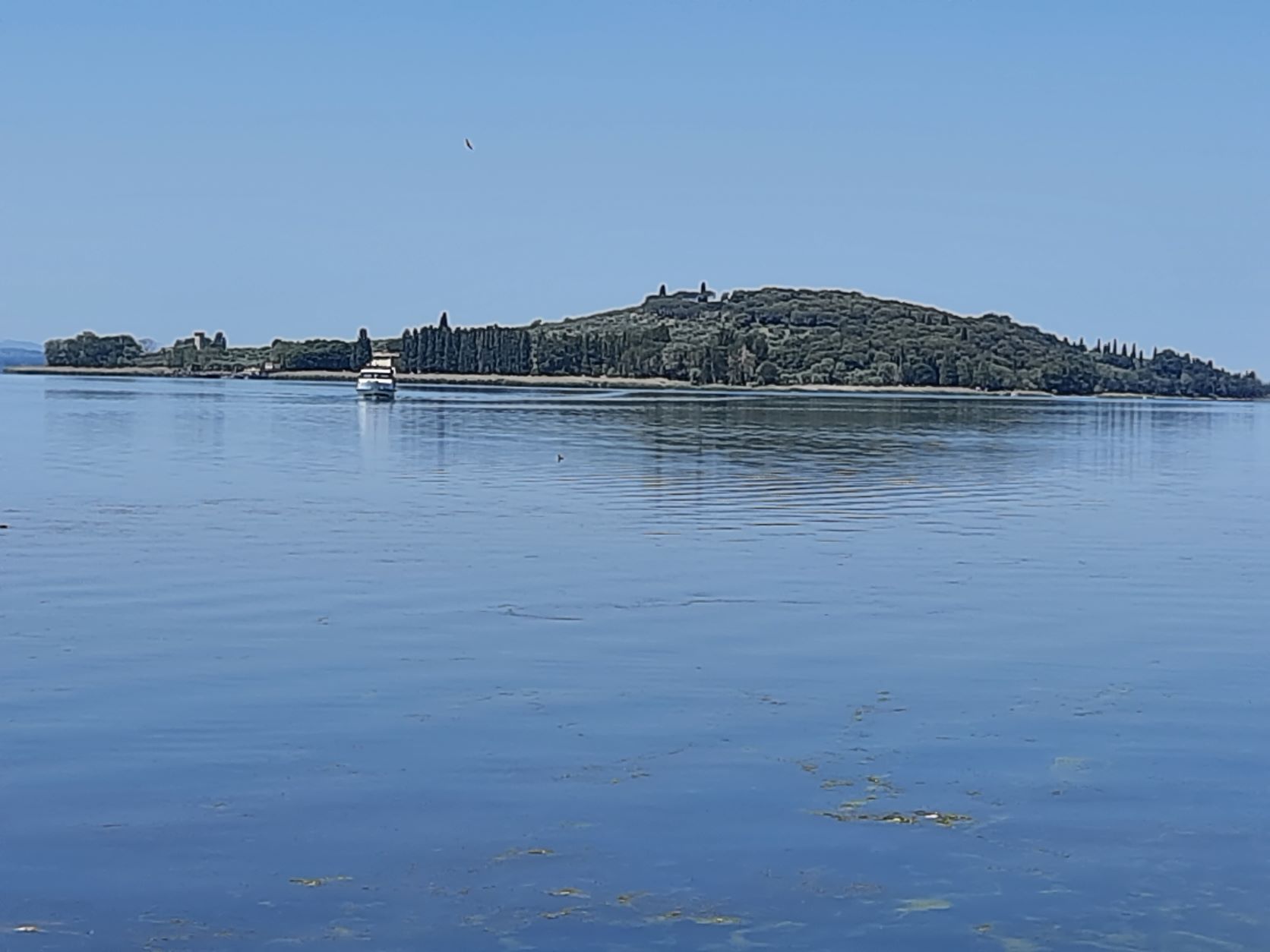 Wir starten unsere Tour im Uhrzeiger-Sinn. Unser erster Stopp ist Tuoro di Trasimeno – hier soll heute Markt sein. Ist er auch – 5 Stände!. Weitergehts über Pasignano nachTorricello – hier gibt’s am Bootsanleger eine erste Rast an der Strandbar. Dann geht’s weiter noch Monte di Lago und San Feliciano. Hier machen wir wieder am Boosanleger mittagspause. Es gibt gefüllte Canneloni und „Carpa di Prochetta“ ( Karpfen aus dem Backofen ) – aber beides gut.